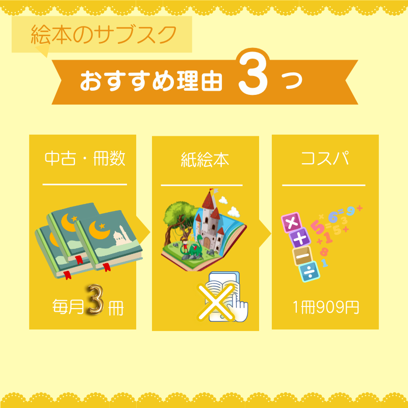 一方、「絵本のサブスク」は1回あたり3冊届いて2,728円。1冊当たり909円で手に入ります。
