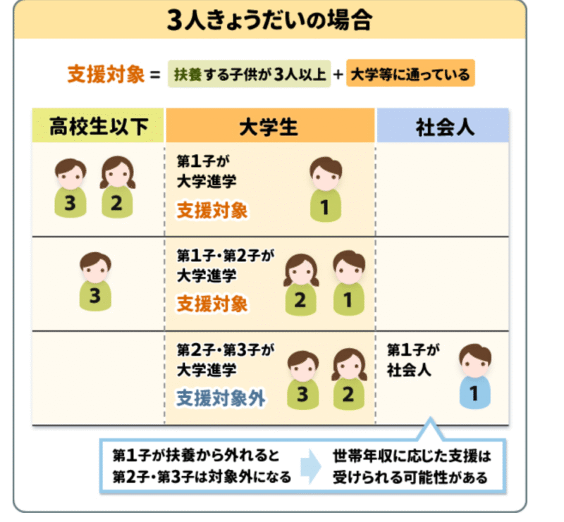 令和7年度から多子世帯(3人同時扶養)への大学無償化制度対象者が拡充されました。