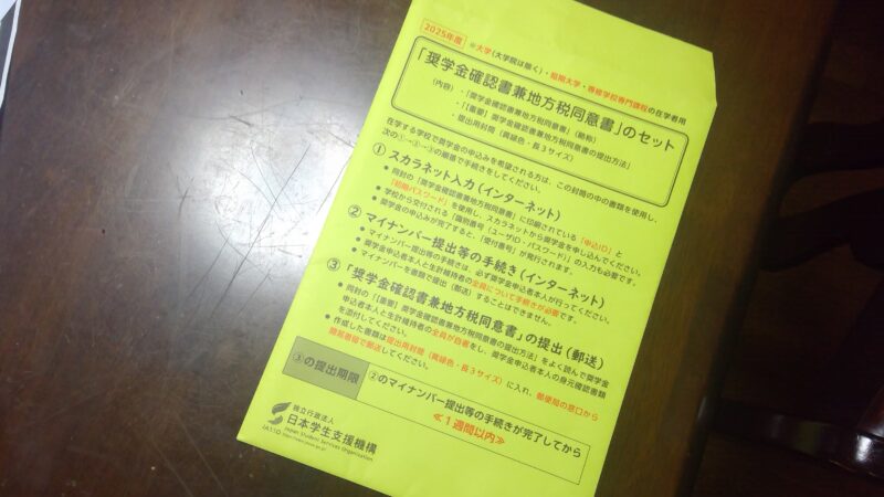 黄緑色の封筒で「奨学金確認書兼地方税同意書」のセットを配布される。